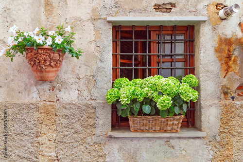 © yrabota, Naklejka premium Beautiful wall of old house in small Italian city Sarzana. Northern Italy, Liguria. Cozy patterns in the stone wall. Window decorated of flowers. Clay pot with flowers on the wall of the building.