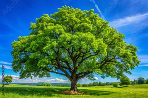 Fototapeta premium Beautiful walnut tree with lush green leaves and a clear blue sky in a serene natural setting
