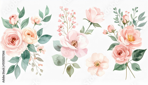 Fototapeta premium Beautiful watercolor arrangement of soft pink and peach flowers with green leaves, perfect for decoration and design use in various artistic projects and materials