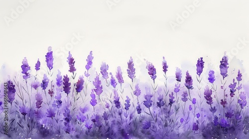 Naklejka premium Beautiful watercolor illustration of a lavender field in full bloom, with vibrant purple flowers against a soft white background.