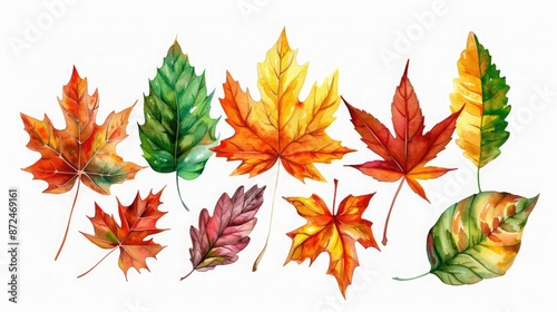 Fototapeta premium Beautiful watercolor illustration of autumn leaves in various colors and shapes, perfect for seasonal designs and nature-themed projects.