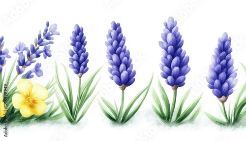Fototapeta premium Beautiful watercolor illustration of vibrant lavender flowers and a yellow...