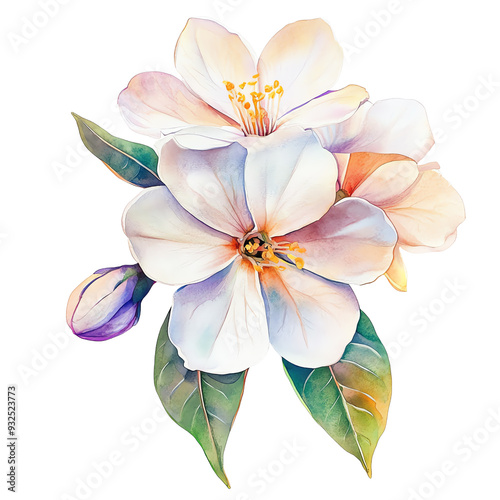 Fototapeta premium Beautiful watercolor illustration of white flowers with green leaves, perfect for spring and nature-themed designs.
