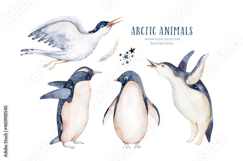© kris_art, Fototapeta premium Beautiful watercolor illustration penguins, arctic tern. Hand drawn image of antarctic birds. Isolated objects on white background.