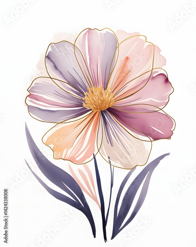 © A.A.Design, Fototapeta premium Beautiful watercolor painting of a flower with detailed green leaves, capturing natural delicate botanical beauty in art. Ai generated hand painted vibes image for textures, wrappers, cards, gift etc.
