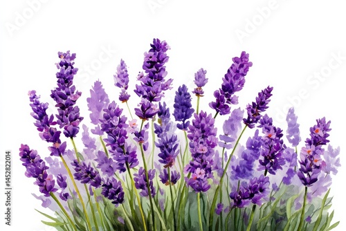 Naklejka premium Beautiful watercolor painting of lavender flowers, bursting with rich purple hues on a white backdrop.