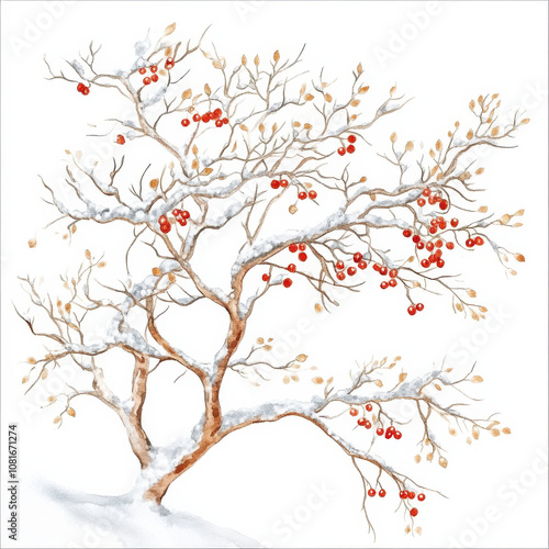 Fototapeta premium beautiful watercolor painting of tree with red berries, snow covered branches, and delicate leaves. serene winter scene captures essence of nature beauty