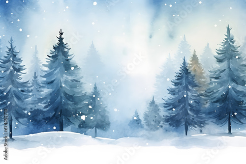 © Firn, Naklejka premium Beautiful watercolor style drawing with trees with falling snow in winter landscape and copy space
