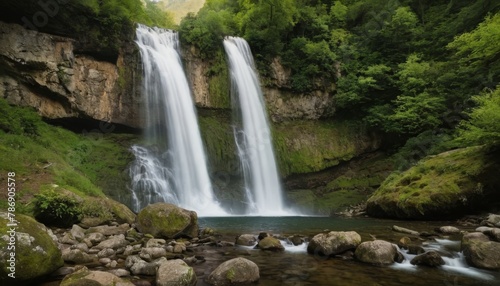 Fototapeta premium Beautiful waterfall amid the mountains' ancient summer woodland