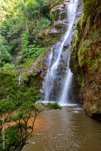 Fototapeta premium Beautiful waterfall among the dense vegetation of rainfoest and rocks in the state of Minas Gerais, Brazil