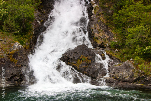 Fototapeta premium Beautiful waterfall between green trees on Nærøyfjord in early summer in Norway