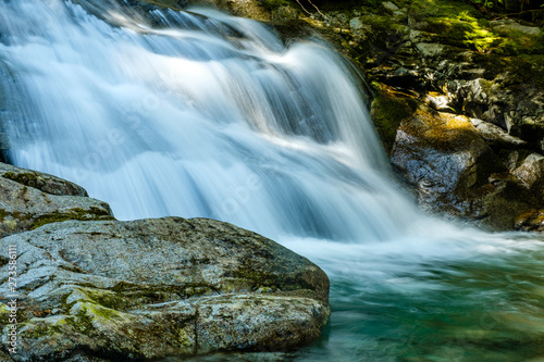 © Yi, Fototapeta premium beautiful waterfall deep inside forest with water running down the creek surrounded by green trees and moss covered rocks