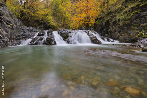 Obraz premium Beautiful waterfall in forest, autumn landscape with lots of red and yellow...