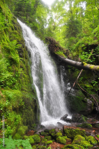 © Ivan, Naklejka premium Beautiful waterfall in green forest in jungle. Jungle landscape with flowing red water of waterfall at deep tropical rain forest. National Park Old Mountain, Serbia