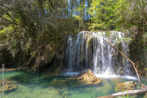 © jordieasy, Fototapeta premium Beautiful waterfall on a bright sunny day in a famous river in Girona