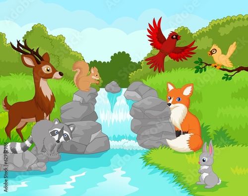 © tigatelu, Obraz premium Beautiful waterfall with wild animals