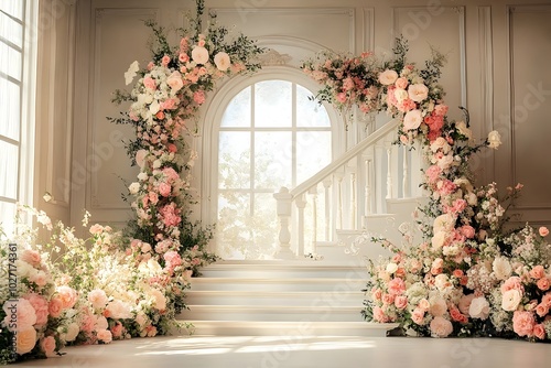 © Chill, Fototapeta premium Beautiful wedding backdrop with flowers and staircase generative AI