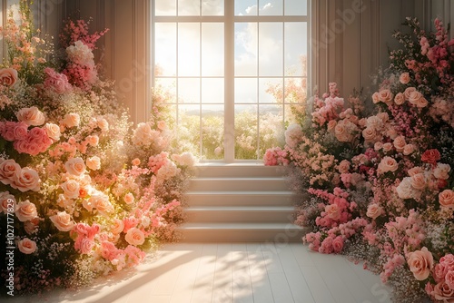 © Chill, Obraz premium Beautiful wedding backdrop with flowers and staircase generative AI