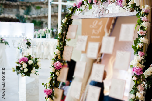 © AS Photo Family, Fototapeta premium Beautiful wedding set decoration in the restaurant. Board with guest list