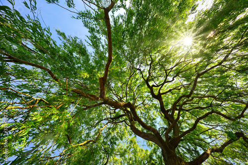 Obraz premium Beautiful weeping willow canopy with the sun shining through the green foliage