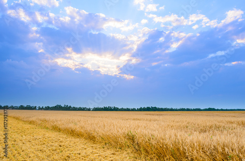 Obraz premium Beautiful Wheat Field under Blue Sky with Dramatic Sunset Clouds