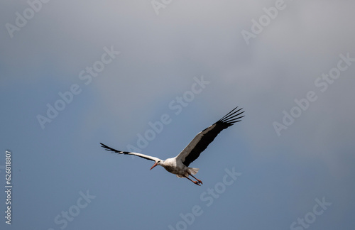 Fototapeta premium beautiful white and black stork soars in the sky on a blue background