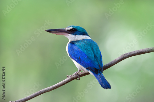 © prin79, Fototapeta premium Beautiful white and white with large bills bird sitting on thin branch over fine blue green background
