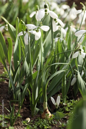 Obraz premium Beautiful white blooming snowdrops growing outdoors, closeup