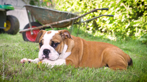 Obraz premium Beautiful white brown english bulldog, beautiful face sitting on grass,...