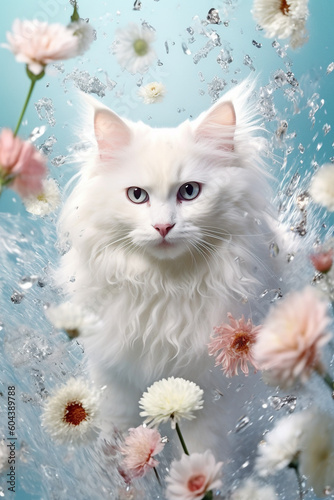 Fototapeta premium Beautiful White Cat on Floral Background. Generative ai