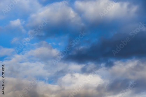 Fototapeta premium Beautiful white clouds on a background of blue sky. Defocused image for design.