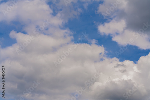 © sandipruel, Obraz premium Beautiful white clouds on a bright blue background.