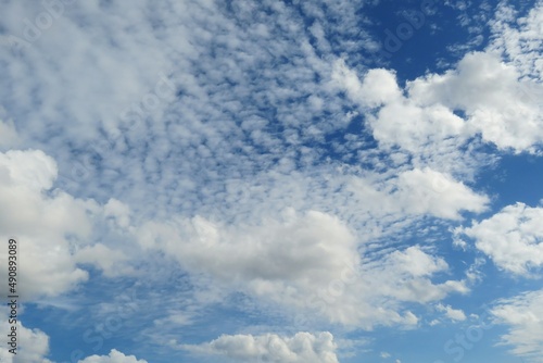 © natalya2015, Fototapeta premium Beautiful white curly clouds in blue sky, natural background