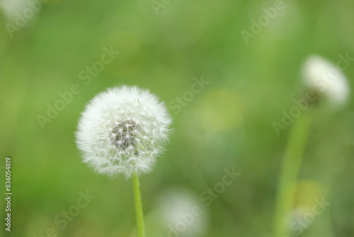 © Pixel-Shot, Fototapeta premium Beautiful white dandelion flower in green grass outdoors, closeup