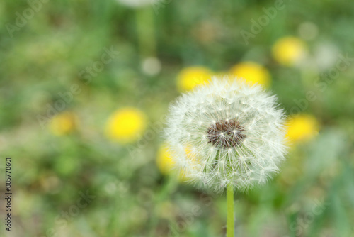 © Pixel-Shot, Fototapeta premium Beautiful white dandelion flower in green grass outdoors, closeup