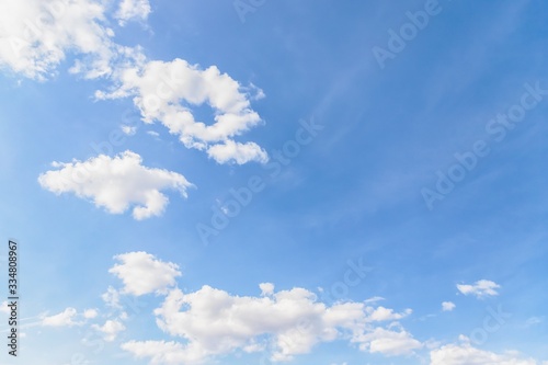 Fototapeta premium Beautiful white few soft fluffy clouds on a blue sky background. Copy space