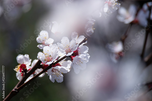 Fototapeta premium Beautiful white flowers blooming on a branch, illuminated by sunlight,...