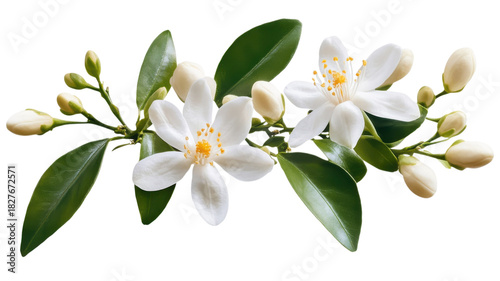 © Zainab, Obraz premium Beautiful white flowers with green leaves and buds in a fresh natural setting.