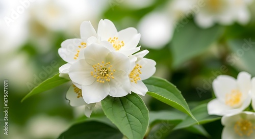 © Yaa, Obraz premium Beautiful white jasmine flowers blooming in spring garden.