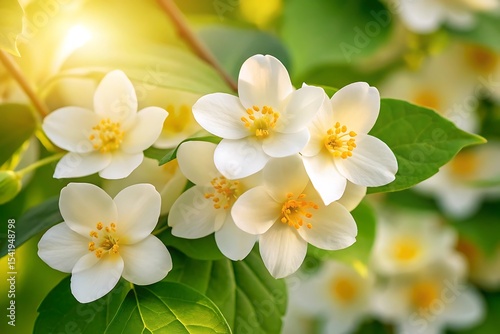 © MDNUR, Fototapeta premium Beautiful white jasmine flowers in sunlight