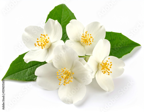 Obraz premium Beautiful white jasmine flowers with green leaves arranged on a white background