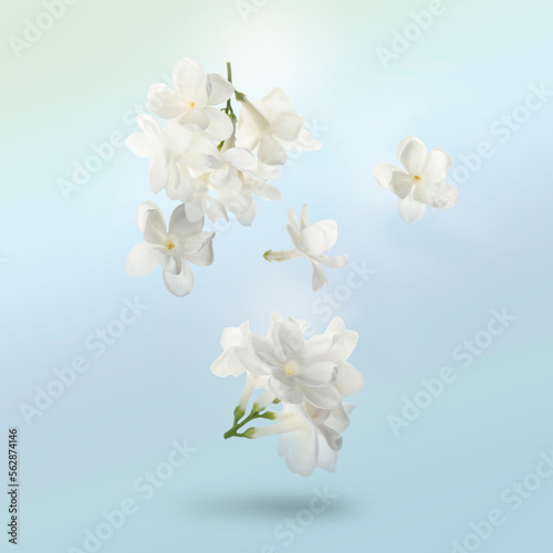 © New Africa, Fototapeta premium Beautiful white lilac flowers falling on pale light blue background