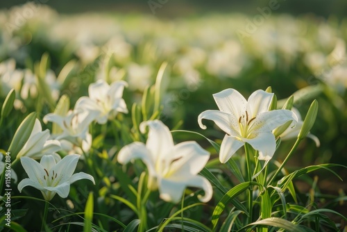 Obraz premium Beautiful white lilies blooming in a field, illuminated by warm sunlight