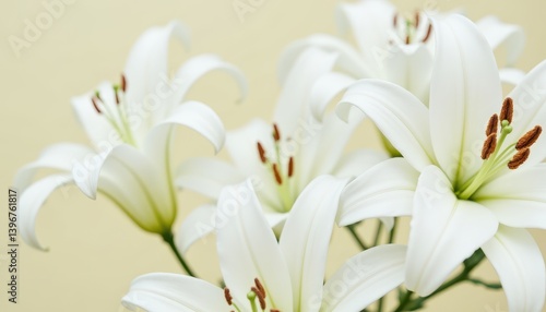 © wpw, Fototapeta premium Beautiful white lilies on solid color background, closeup. Floral decor. photo.