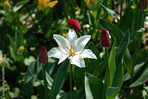 © Galina, Obraz premium Beautiful white lily and red tulips in summer park