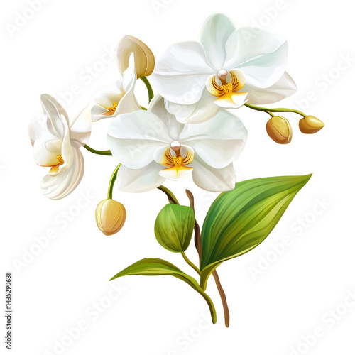 © Ifti Digital, Naklejka premium Beautiful white orchid branch with buds and green leaves in a serene setting, White orchid branch with flowers, buds and leaves