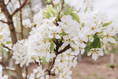 © anatoliycherkas, Fototapeta premium Beautiful white pear tree flowers blooming in spring