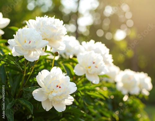 Obraz premium Beautiful white peonies in a garden bathed in sunlight