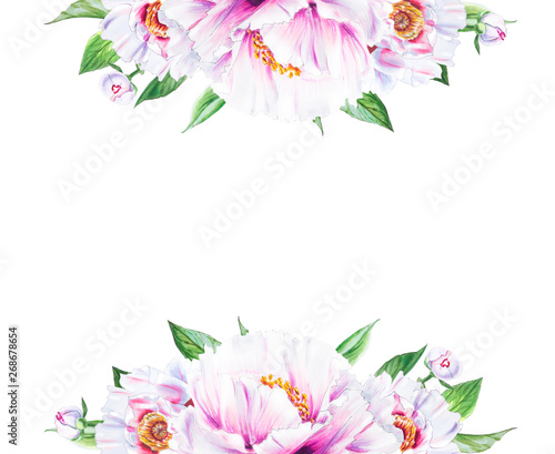 Naklejka premium Beautiful white peony. Bouquet of flowers. Floral print. Marker drawing. Watercolor painting. Wedding and birthday composition. Greeting card. Flower painted background. Hand drawn illustration.