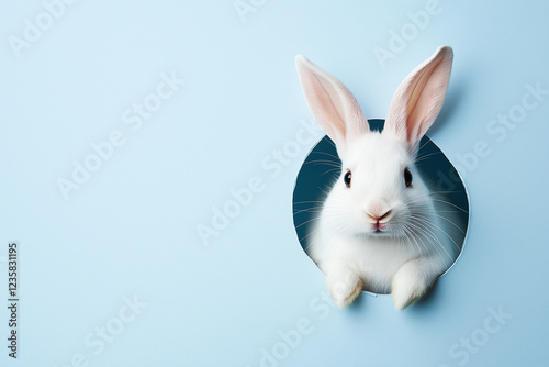 © silapin, Obraz premium Beautiful white rabbit comes out of a hole on a blue background. Easter egg banner concept.